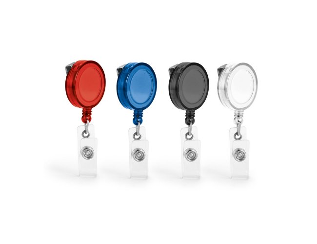 Porta crachá com clipe metálico com mecanismo extensível até aos 900 mm. Com presilha transparente e botão para adicionar bolsa porta-cartões. O mecanismo retrátil permite apresentar seu cartão ou credencial com segurança e comodidade. ø32 x 9 mm