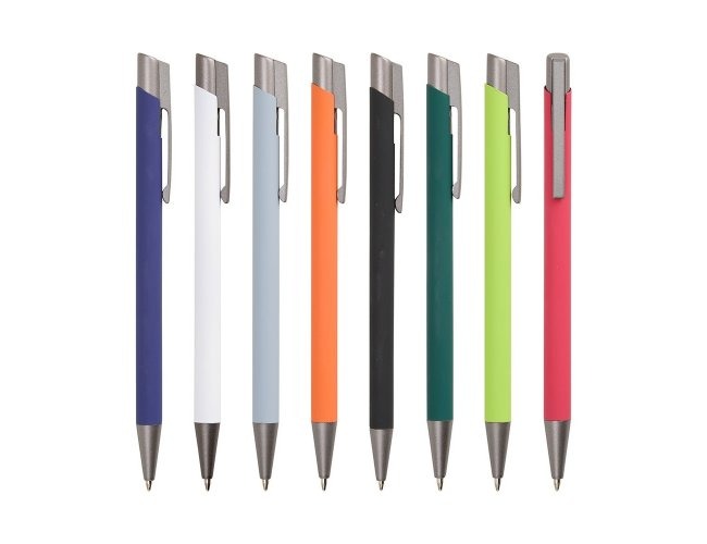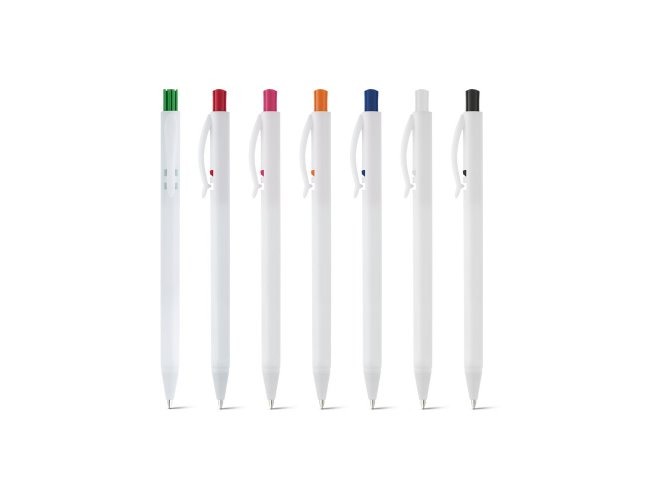 Esferográfica em ABS com acabamento brilhante e mecanismo colorido. Escrita em azul até 1,5 km. Produto certificado de acordo com a portaria Inmetro nº423 de 8/out/2021. ø9 x 141 mm