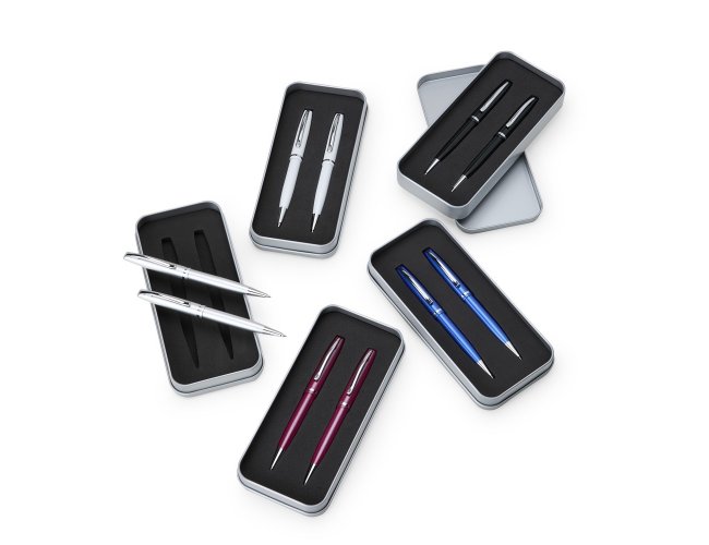 Descrição: Conjunto de caneta e lapiseira metálicas em estojo metal. Caneta e lapiseira possuem acabamento brilhante, carga esferográfica azul de 1.0mm e acionamento por rotação.