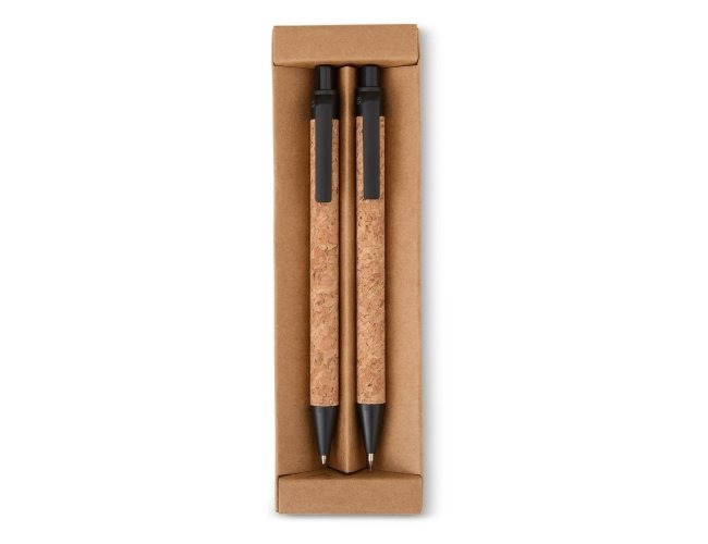Kit ecológico, caneta e lapiseira de cortiça com detalhe em palha de trigo e estojo de kraft. Carga esferográfica azul 1mm e lapiseira 0.7mm com acionamento por clique.